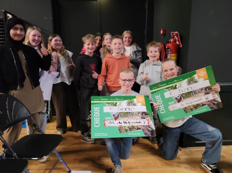 Deze week hebben groep 7 en 8 meegedaan aan het project ‘Ons groene schoolplein’. Beide groepen dachten na over de inrichting van het schoolplein en dachten daarbij ook na hoe dit ‘groener’ en biodiverser kan. Groep 7 maakte daarvoor een film en groep 8 tekende eerst het schoolplein uit en maakte vervolgens een mooi 3D-ontwerp. Beide groepen presenteerden dit woensdag aan de gemeente en 14 andere scholen. Ze brachten beide €500,- mee om te investeren in ons schoolplein, supergoed gedaan!